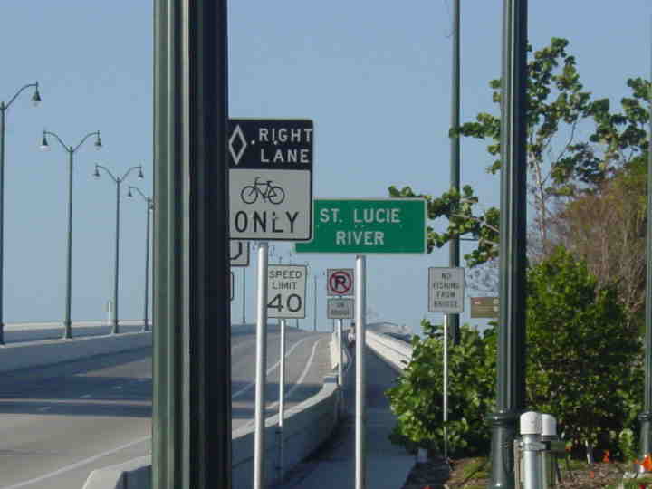 In addition to Jan and Bud, Kathy also had her brothers Tommy and Bobby visiting and staying as well. Tommy now lives in Chicago and in the past has been our knowledgeable host when we visited the windy city. Tommy is good company and fun to be around. Tommy unveiled a hidden talent for the game of tennis and he and Diane played a match that went down to the final game. Bobby is also a fun person to be around, he was struggling with the idea of actually acting "like a grownup" for a few minutes. Bobby has a good sense of humor and he was trying to follow Tommy's recommendation of a low carb diet during the week, but staying away from the carbs was not as easy for Bobby as Tommy. Bobby was becoming a regular at the local Applebee's having tried most of the offerings on the desert menu. We had a really good time going out to dinner with Tommy and Bobby on Tuesday evening at T.A. Verns in downtown Stuart. I highly recommend the crab cakes at T.A. Verns. Even though Bobby didn't order food, I think he ate as much as anyone else. We had a new waiter that was working his first day, and when Tommy order a cup of coffee he wasn't sure if they had any, he had to go check. Tommy actually bussed our table and went in and got paper towels to wipe it down. I think they might have hired him on the spot if he wanted the job. Stuart is a very cool city. The downtown has a lot of interesting and quaint places to shop and eat. They have what the locals call "confusion corner" at one of the main intersections. I have to admit it was not a normal rotary with all the stop signs and yield signs, it was a bit confusing. In addition to being confusing it was very beautiful with an artistic water fountain in the center. For years we have heard the Mielkes talk about the fresh fruit and frozen yogurt lunch at a popular local restaurant called Natures Way, we finally got a chance to experience it first hand and it was very good. Bob and I biked all over the area. The first ride we did was about 16 miles total, the second about 20 miles and we were half way into what was going to be a 24 or 25 mile ride when one of the bikes got a flat tire and we had to abandon the ride. Luckily Diane and Kathy had just finished their shopping trip and were home when we called to be picked up. We were stranded right in front of one of the local libraries and we checked out the library while we waited for our ride back. We had already eaten lunch at Grumpy's Grille in Hobe Sound where we both enjoyed excellent burgers and above average diet coke. On our first ride late afternoon on Sunday December 28,2003 we rode through the B&A Flea Market that was closing up for the weekend. On our second ride we stumbled across another PCT, this one being Pollution Creek Trail. It was a water treatment facility tucked in behind some neighbor hoods and it was a water pollution control facility. It had a small lake with a fountain in the middle and a trail around the whole thing. It also had nice wooden bridges connecting one side to the other. It was an attractive area, but the pollution signs and the warnings not to keep any fish you might catch made us think the water might not be as safe as it appeared. On this second ride we stared out early and stopped at a place called "That Place Cafe" for a late breakfast. I had a breakfast sandwich which I like to do when I am on vacation. Bob had the $2.50 breakfast special that cost $2.99. Bob asked the waitress to explain why the sign at the cash register said $2.50 but it actually cost more. It must be a local thing because I never got the concept either and the waitress certainly couldn't figure it out. The diet coke there was only average. We sat outside while we ate our breakfast. We traveled to Hutchison Island which required us to go over a couple bridges. The first bridge was decent size and it was a good workout going up the grade. The second bridge was much smaller and easier to travel. We went past the fire station and Elliot Museum on the way to the beach which was very nice. I never